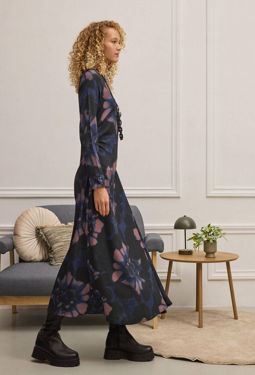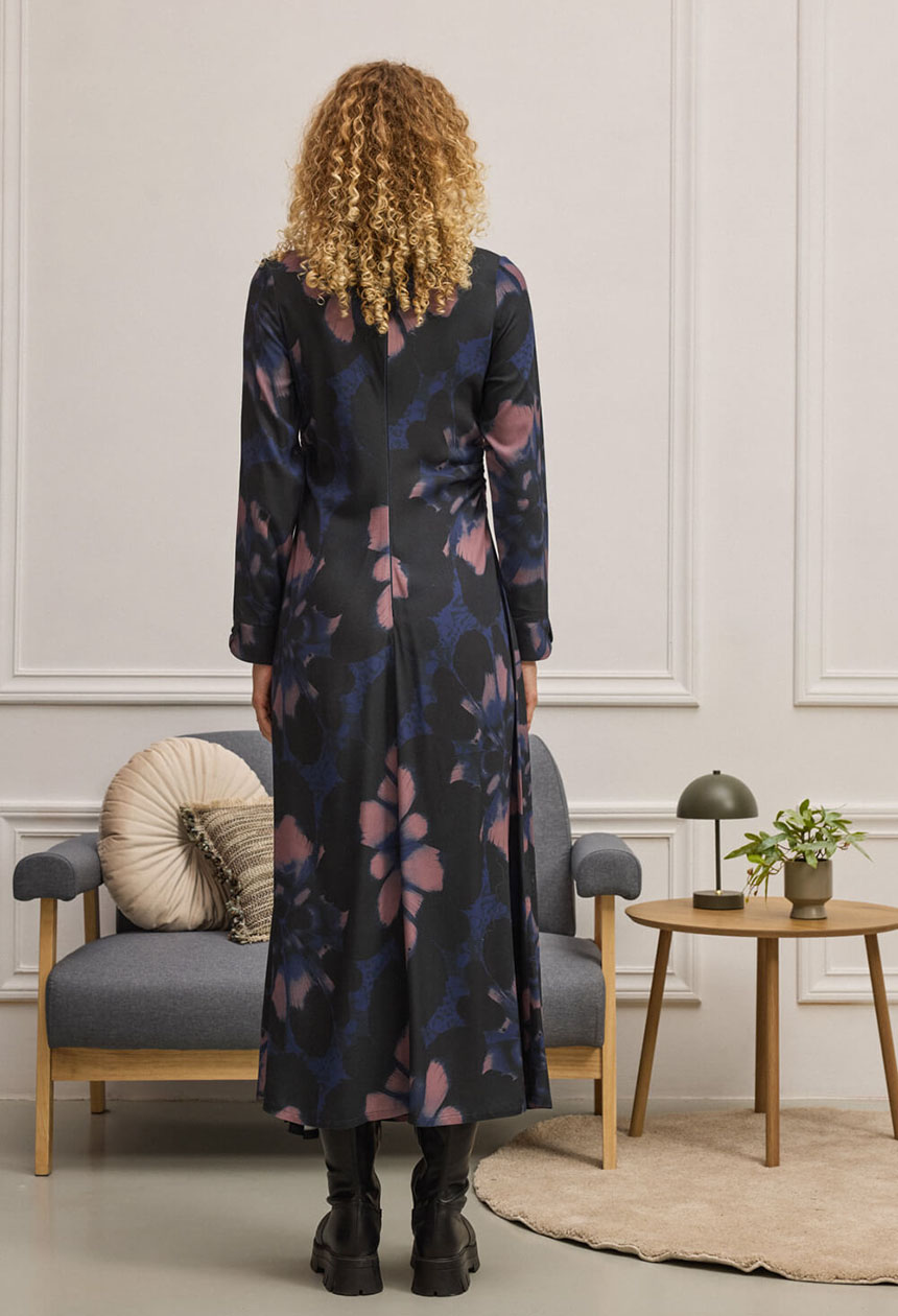 Midi φόρεμα με εντυπωσιακό floral print, από 100% viscoze Ecovero που προσφέρει αέρινη κίνηση και απαλή αίσθηση. Οι σούρες στα πλαϊνά δημιουργούν κολακευτική εφαρμογή, η drape λεπτομέρεια που σχηματίζεται μπροστά από τη μία πλευρά προσθέτει κίνηση και κομψότητα. Διαθέτει στρογγυλή λαιμόκοψη, μακριά μανίκια που καταλήγουν σε μανσέτα με κουμπί και κλείσιμο στο πίσω μέρος με αόρατο φερμουάρ. Μεσάτη γραμμή που ανοίγει σταδιακά προς τα κάτω για θηλυκή σιλουέτα.
