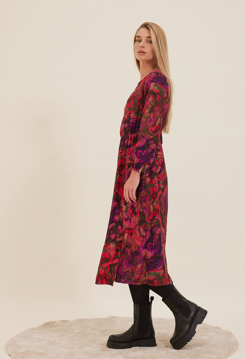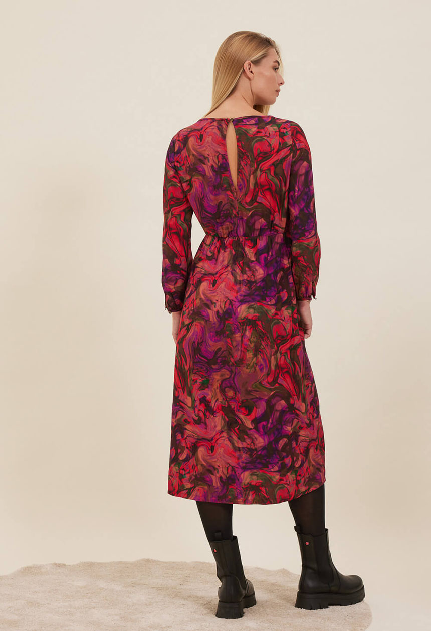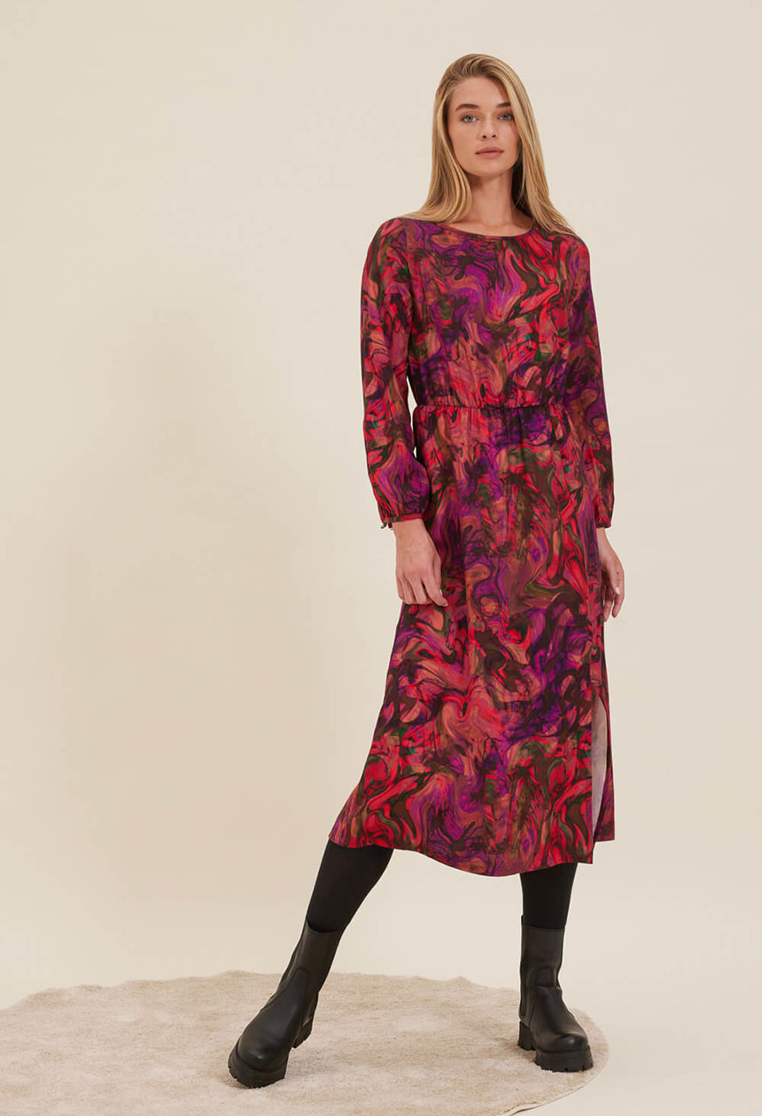 Midi εμπριμέ φόρεμα, με λάστιχο στη μέση, ραφή στο πλάι μπροστά, που τελειώνει σε σκίσιμο. Κουμπώνει πίσω με ένα μεταλλικό κουμπί. Έχει φαρδιά λαιμόκοψη και μανίκια με σούρα και άνοιγμα. Σε ύφασμα από εμπριμέ βισκόζη σε αποχρώσεις του κόκκινου και του ροζ.