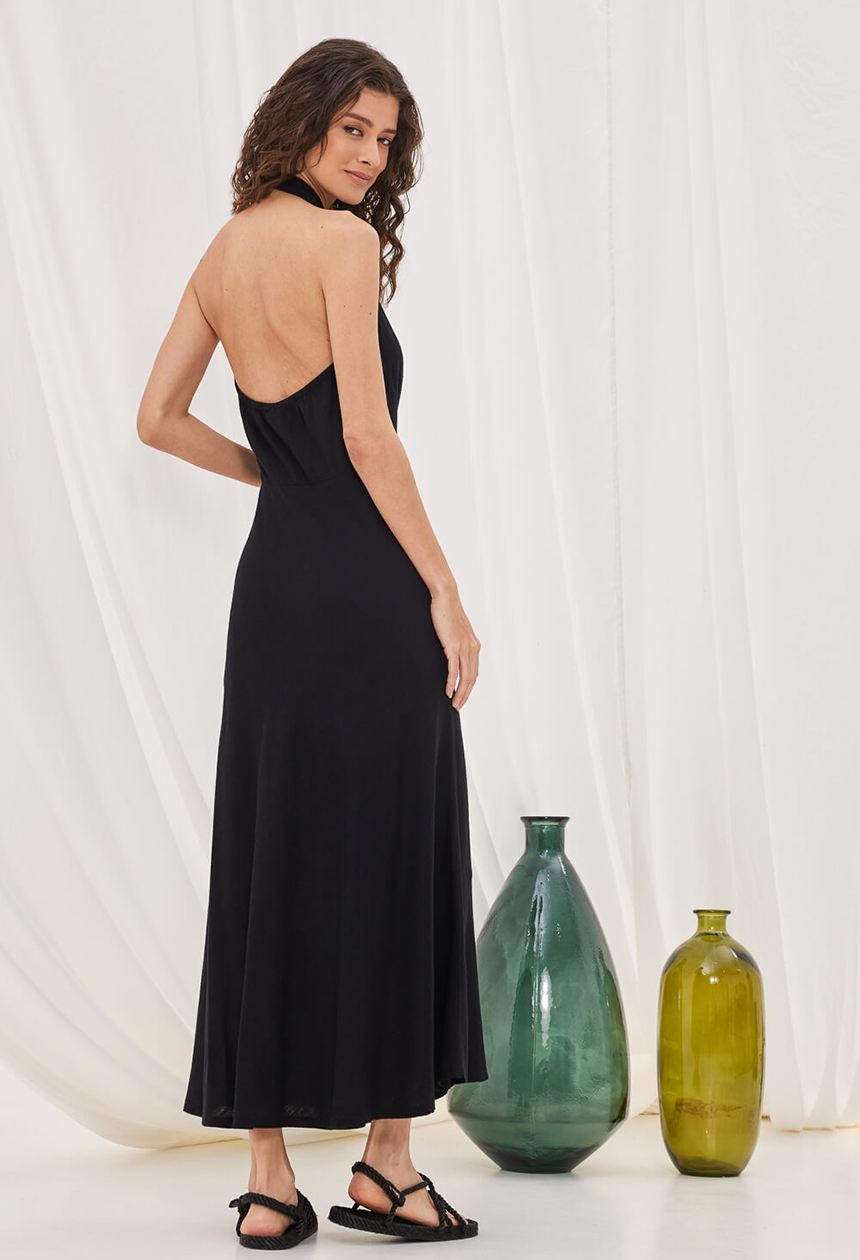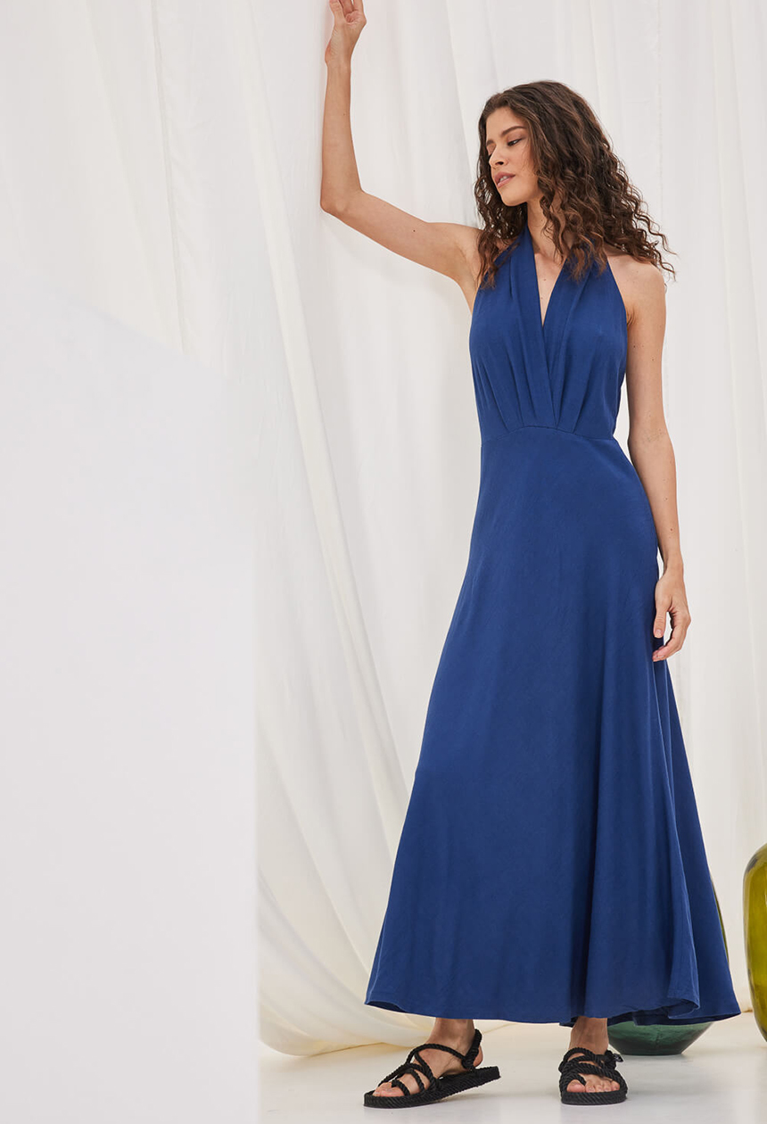 Φόρεμα σε ύφασμα με βισκόζη και λινό με σταύρωμα εμπρός και πιέτες, ανοιχτή πλάτη και φερμουάρ στην πλαϊνή.