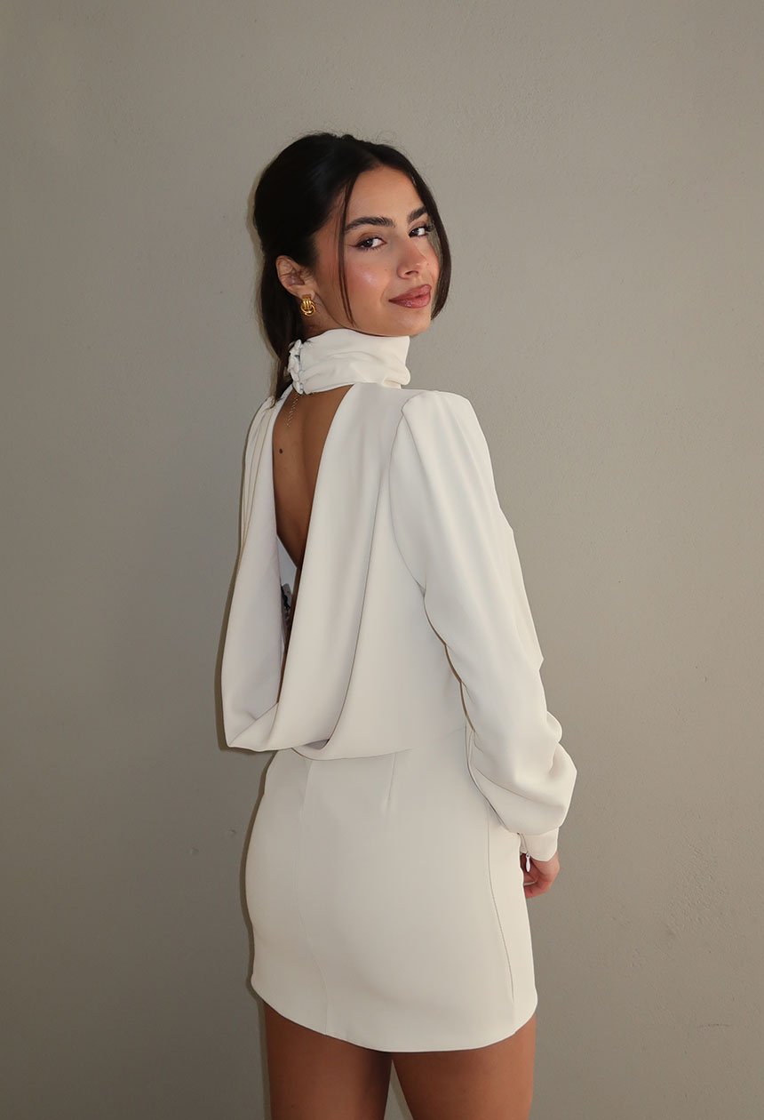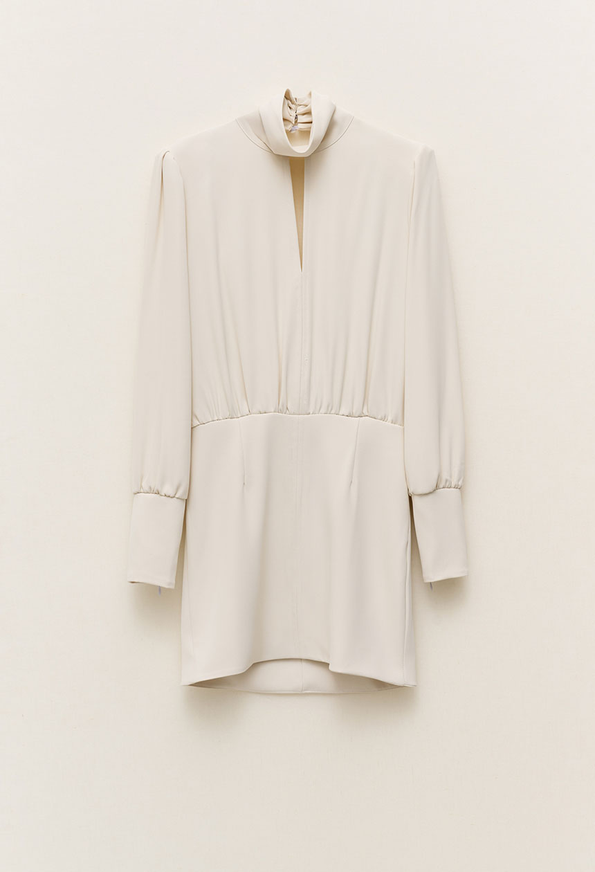 Φόρεμα μίνι με ψηλό λαιμό,άνοιγμα στο ντεκολτέ,ανοικτή ντραπέ πλάτη,μακρύ μανίκι,λεπτές βάτες.