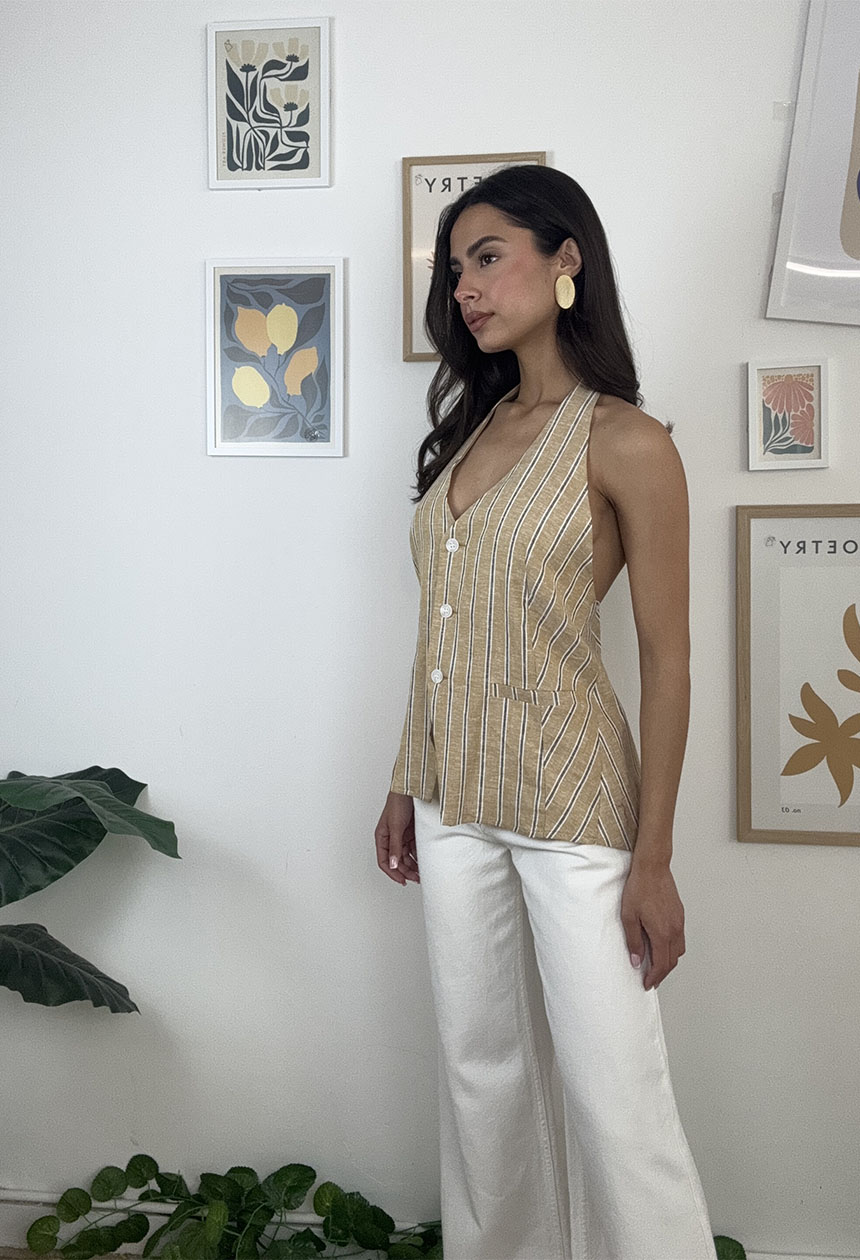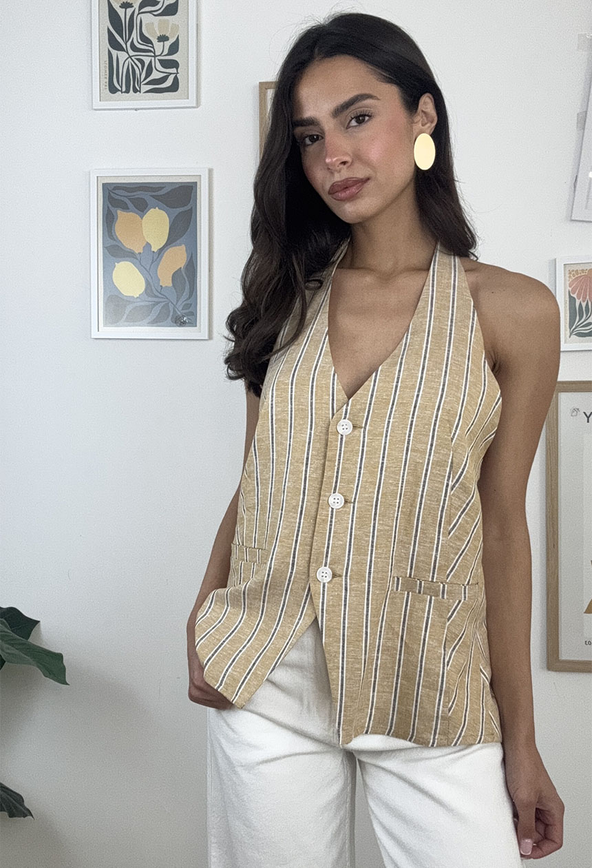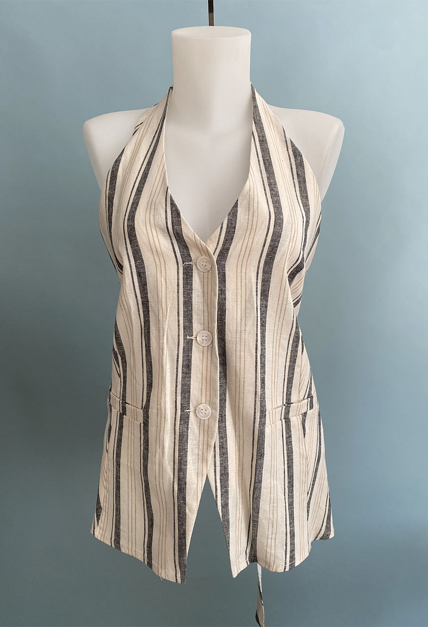 Γιλέκο ριγέ με ιδιαίτερο σχέδιο,εξώπλατο,δένει στο λαιμό και στη πλάτη,κλείνει με κουμπιά.
