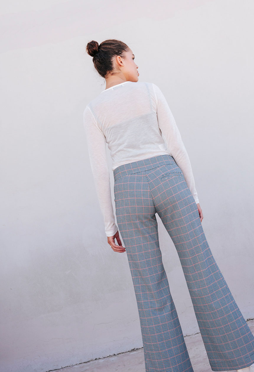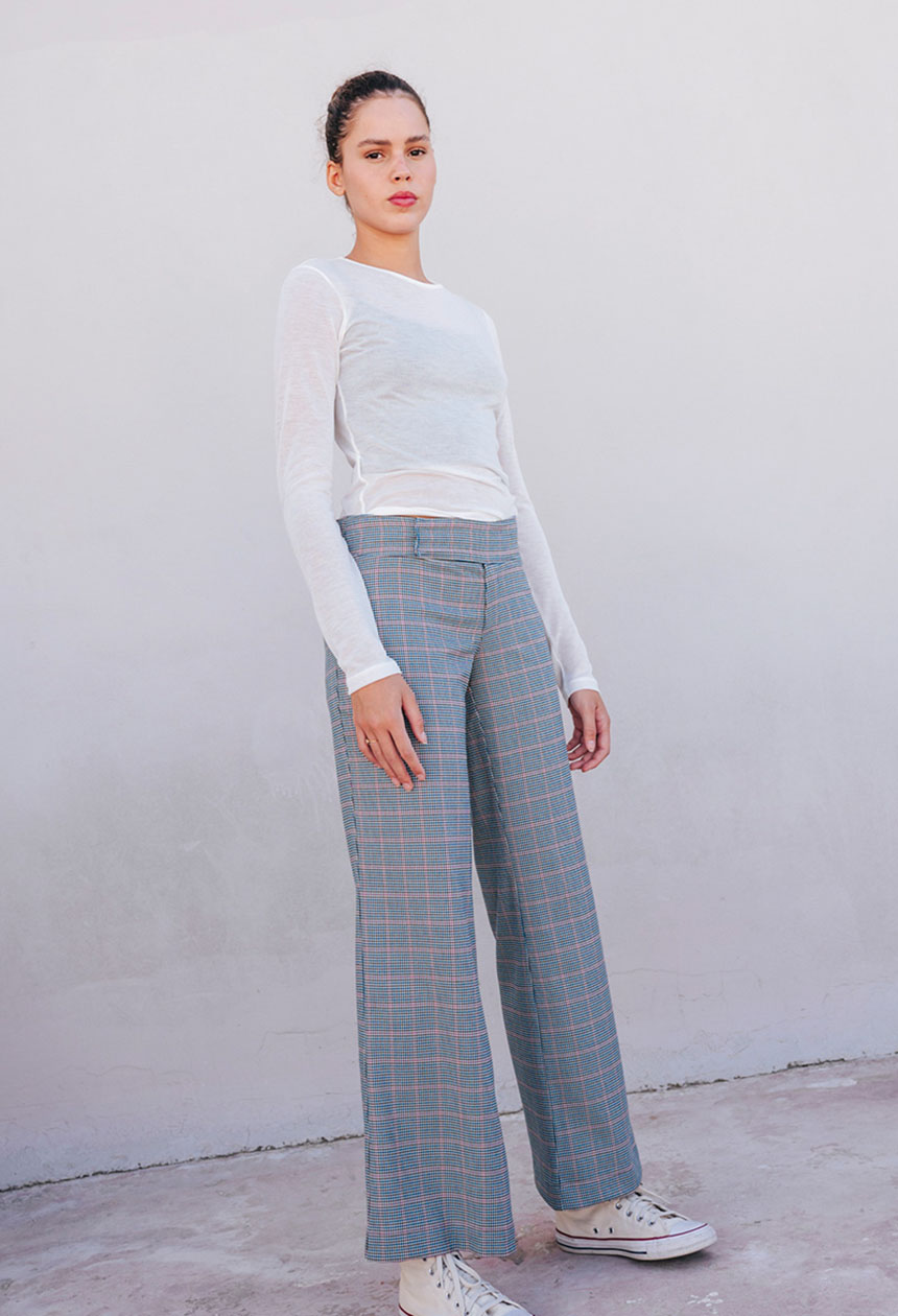 Χαμηλόμεσο παντελόνι καρό σε ίσια γραμμή, κλείσιμο μπροστά με φερμουάρ.