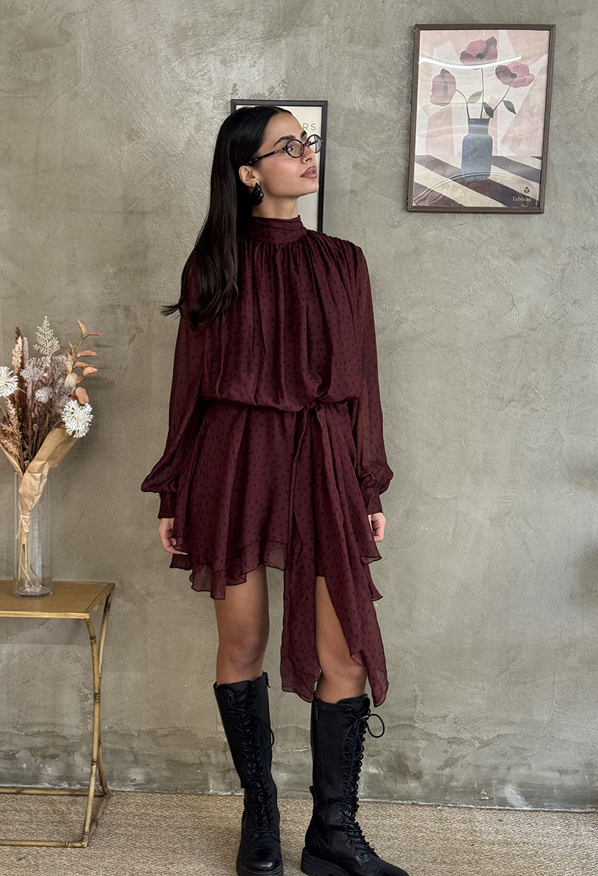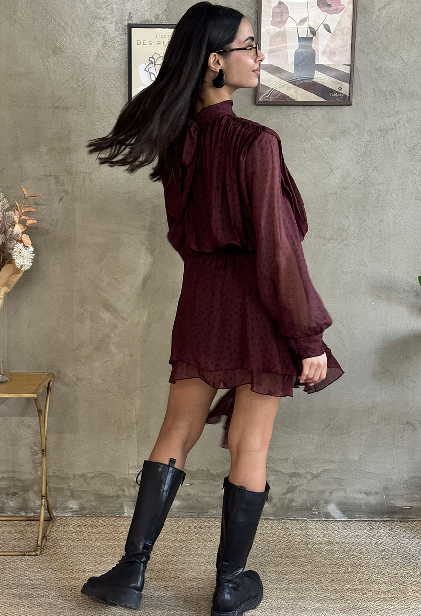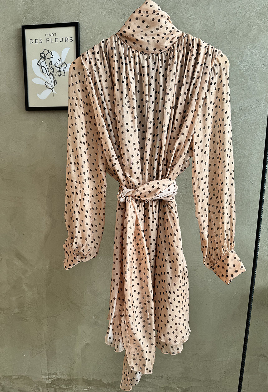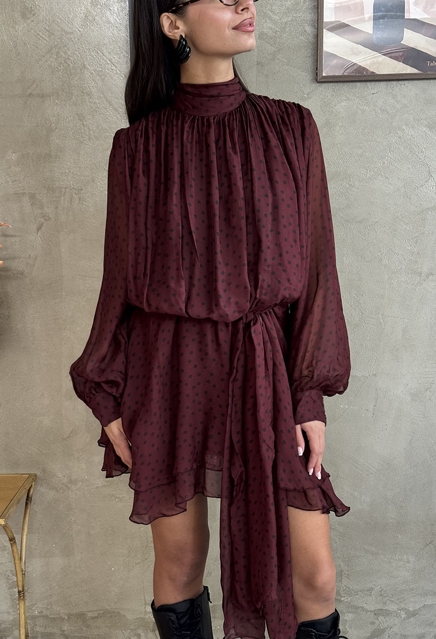 Κοντό φόρεμα από τούλι με μείγμα μεταξιού και πουά μοτίβο. Μακριά μανίκια με μανσέτες. Διαθέτει ντραπέ λεπτομέρειες. Λάστιχο στη μέση με ζώνη. Ανοιχτή γραμμή. Ψηλός λαιμός με δέσιμο σε φιόγκο. Απαλή/άνετη εφαρμογή.