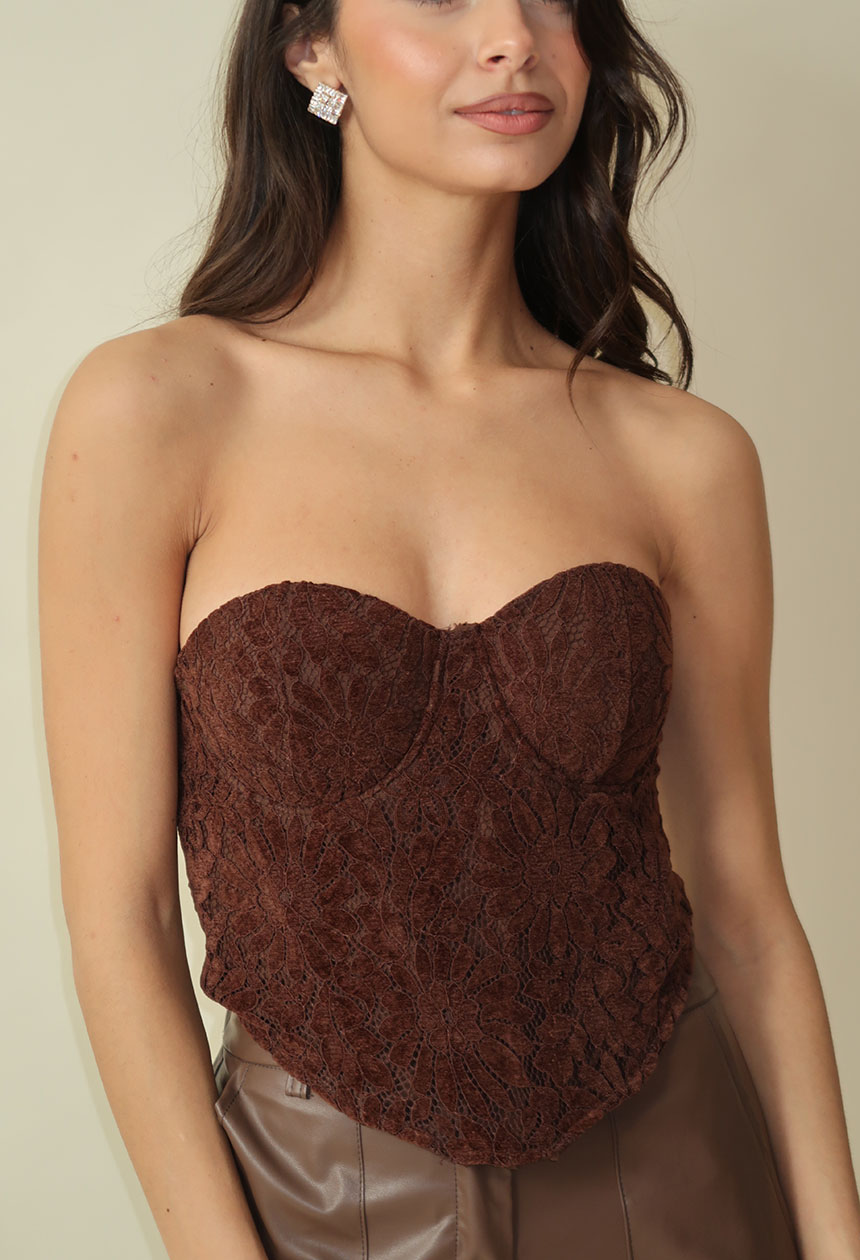 Κορσέ σε καφέ βάση, διακοσμημένο με δαντέλα φλοράλ σχέδιο. Η εφαρμογή του αγκαλιάζει το σώμα και τονίζει τη σιλουέτα, ενώ οι ενισχύσεις προσφέρουν στήριξη και άψογο σχήμα.