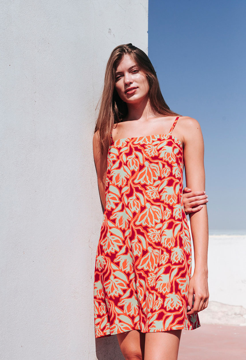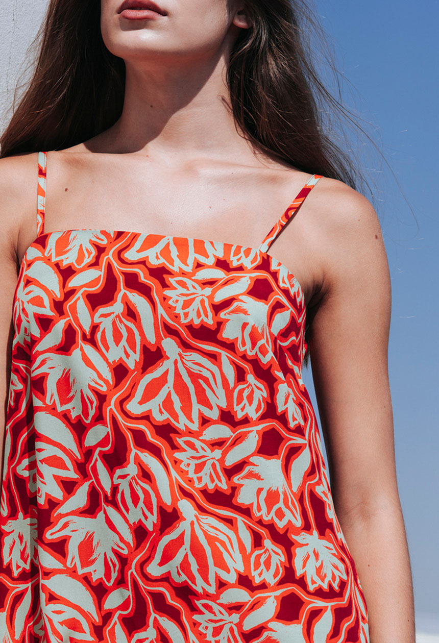 Φόρεμα αμάνικο κοντό με αυξομείωση στις τιράντες και ίσια λαιμόκοψη. Κλείσιμο με φερμουάρ στην πλάτη.