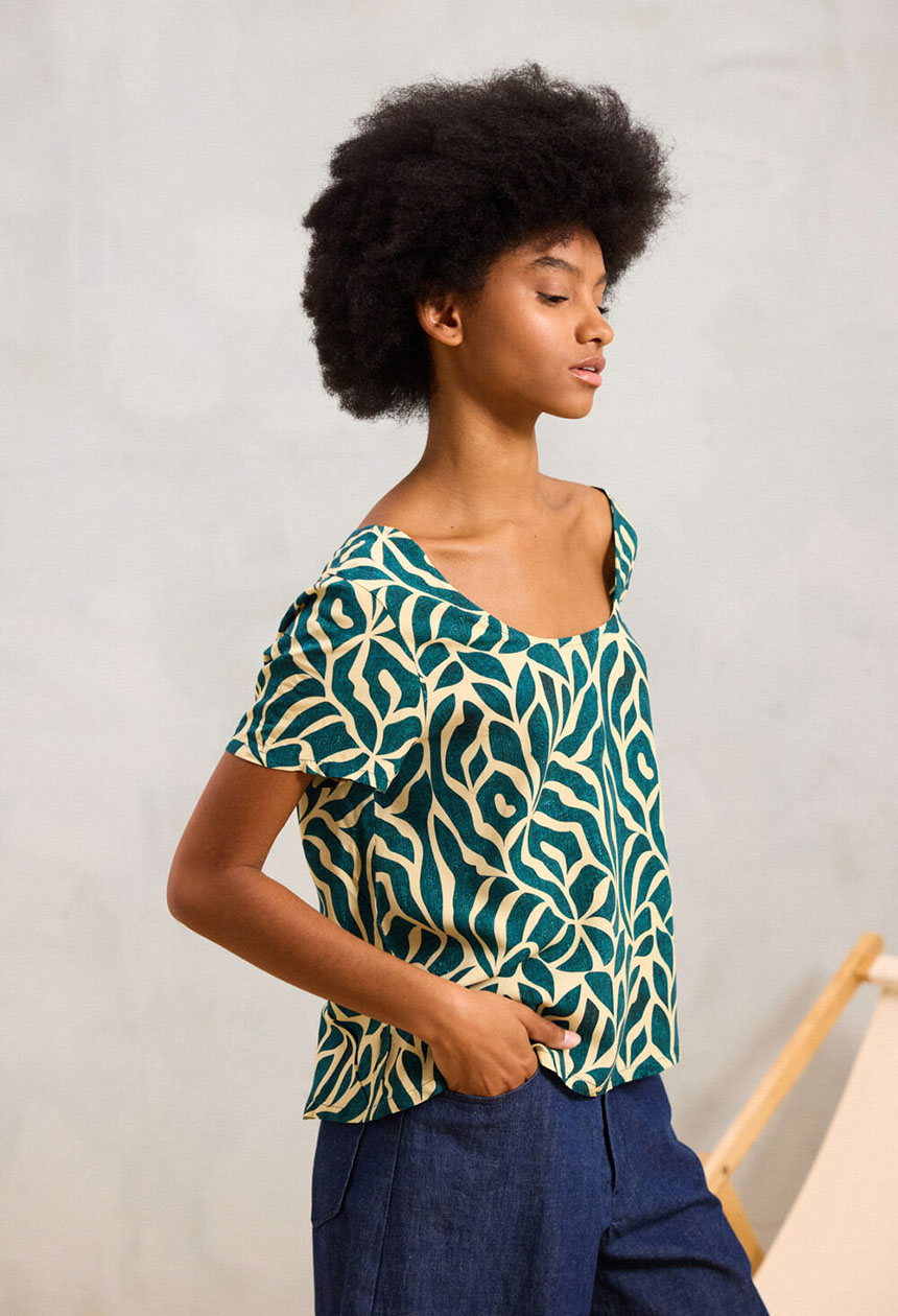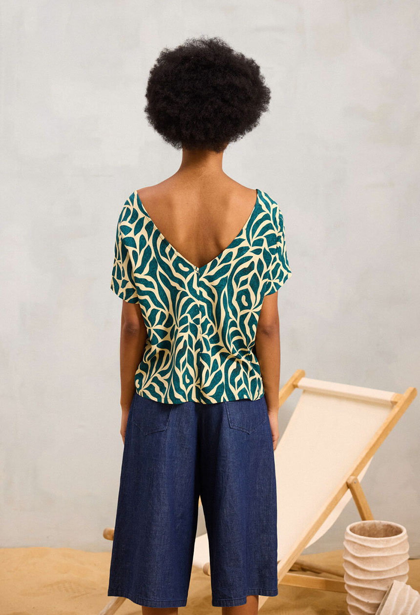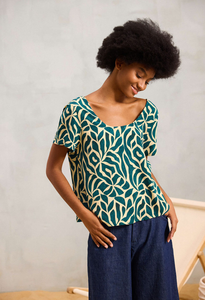 Μπλούζα με κοντό μανίκι και στρογγυλή λαιμόκοψη μπροστά, από δροσερό rayon με απαλή υφή. Το αφαιρετικό μοτίβο δίνει ζωντάνια και χαρακτήρα, ενώ το V άνοιγμα στο πίσω μέρος προσθέτει μια διακριτική θηλυκή νότα. Η άνετη γραμμή εξασφαλίζει ελευθερία κινήσεων και καθημερινή κομψότητα με σύγχρονο ύφος.