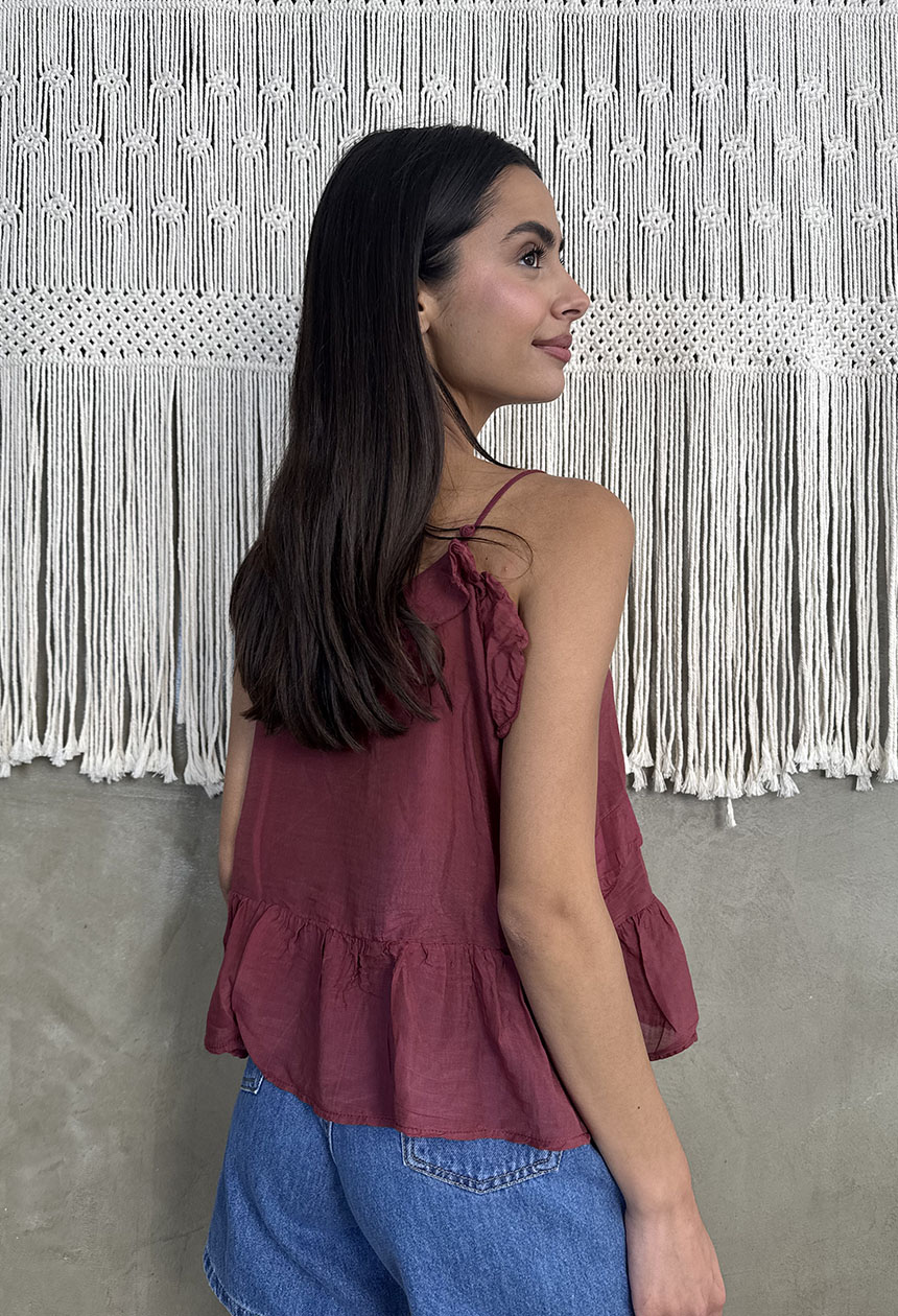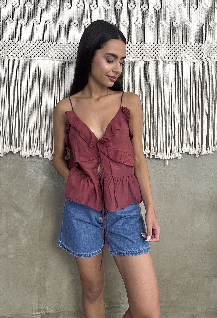 Ανανέωσε το καλοκαιρινό σου στιλ με αυτή τη θηλυκή και αέρινη μπλούζα! Σε εντυπωσιακά χρώματα, διαθέτει λεπτές τιράντες, διακοσμητικά βολάν στο ντεκολτέ και κάτω μέρος, καθώς και ρυθμιζόμενο δέσιμο μπροστά για μοναδική εφαρμογή. Η αέρινη γραμμή της την καθιστά ιδανική για τις ζεστές ημέρες, ενώ συνδυάζεται τέλεια με σορτς, τζιν ή φούστες για casual αλλά κομψές εμφανίσεις.