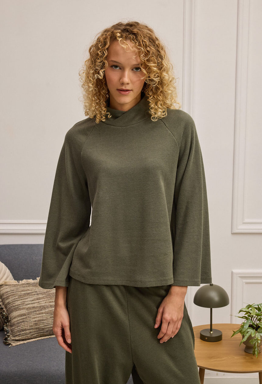 Μπλούζα σε χαλαρή γραμμή από μαλακή, ελαστική ύφανση με λεία υφή. Διαθέτει ιδιαίτερη λαιμόκοψη με σταυρωτό/κρουαζέ κόψιμο που δημιουργεί εφέ χαλαρού ζιβάγκο, προσθέτοντας ενδιαφέρον στο επάνω μέρος. Μακρία μανίκια.