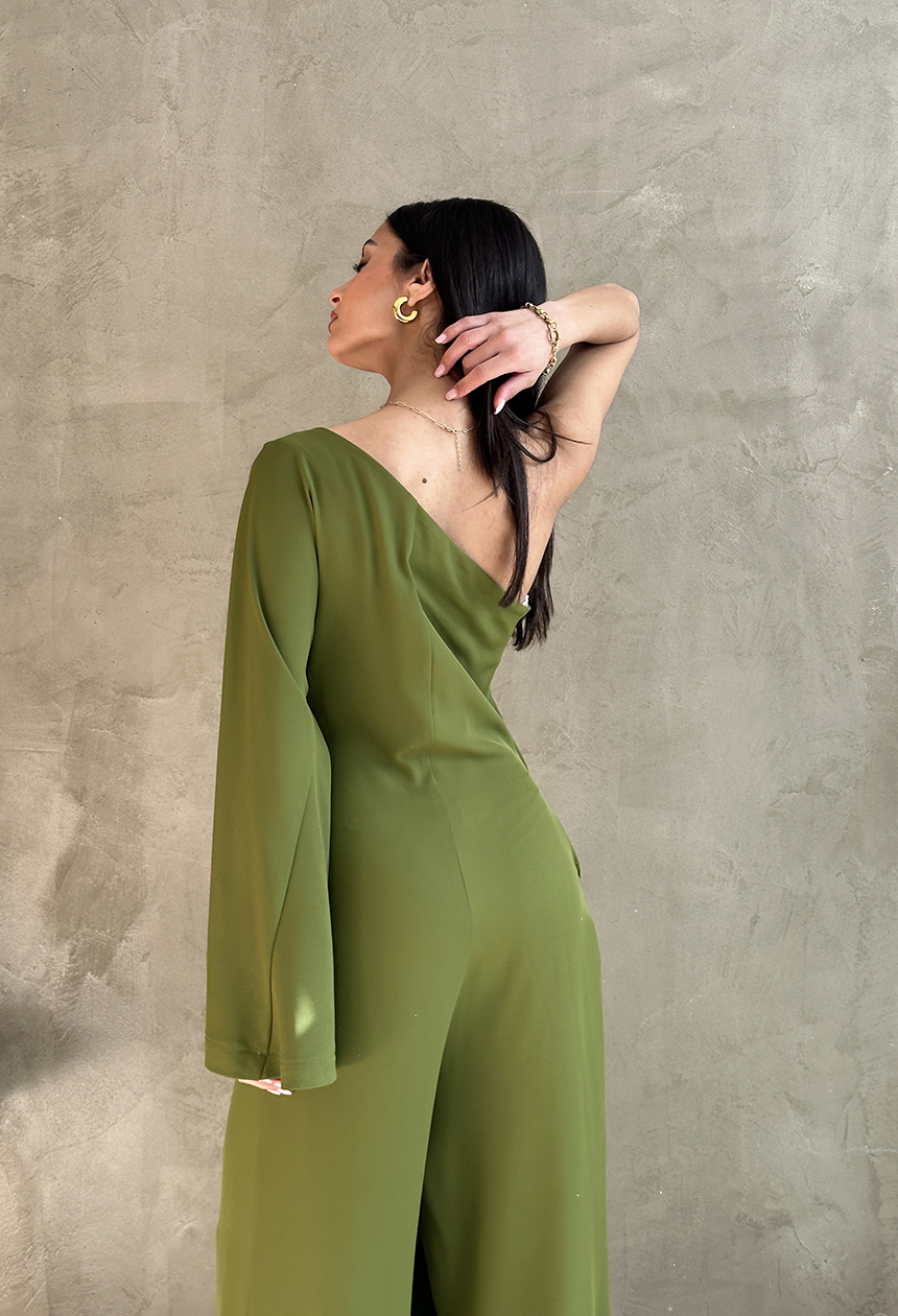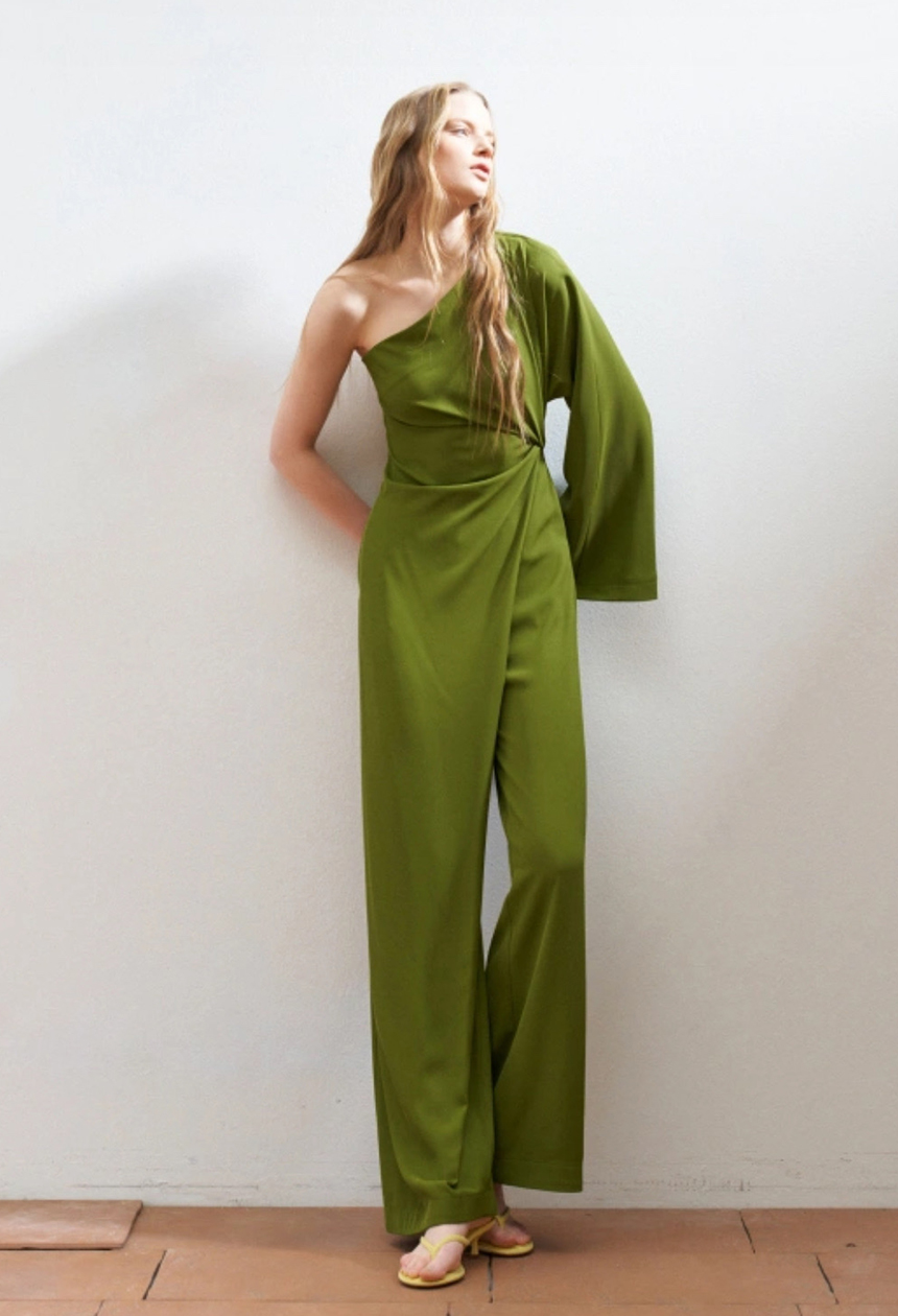 Ολόσωμη φόρμα με ένα ώμο,μακρύ μανίκι,ντραπέ λεπτομέρεια,ασύμμετρο σχέδιο,αγκαλιάζει τη σιλουέτα,ιδανική για ιδιαίτερες περιστάσεις.