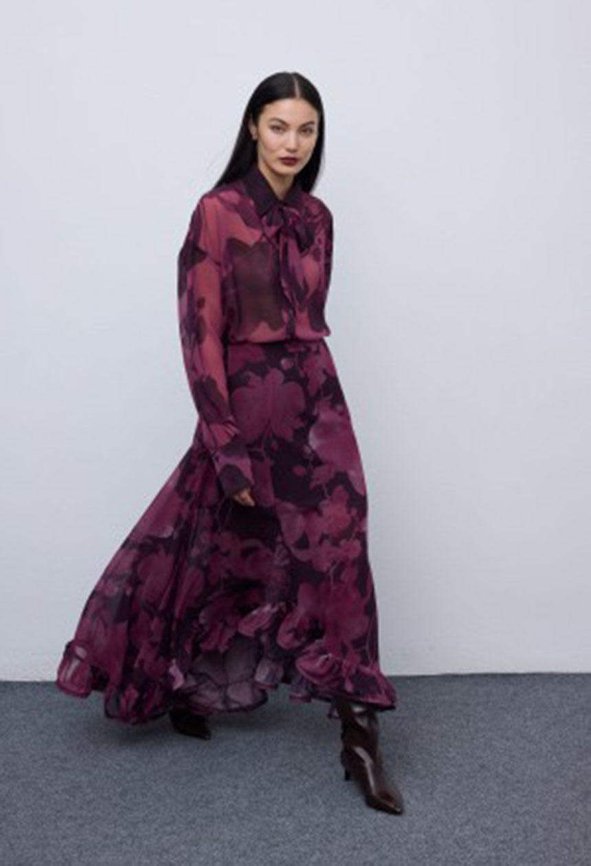 Φούστα σε μακρύ μήκος,με αέρινο στυλ,ιδιαίτερο βολάν στο τελείωμα,από silky tuch φλοράλ ύφασμα.