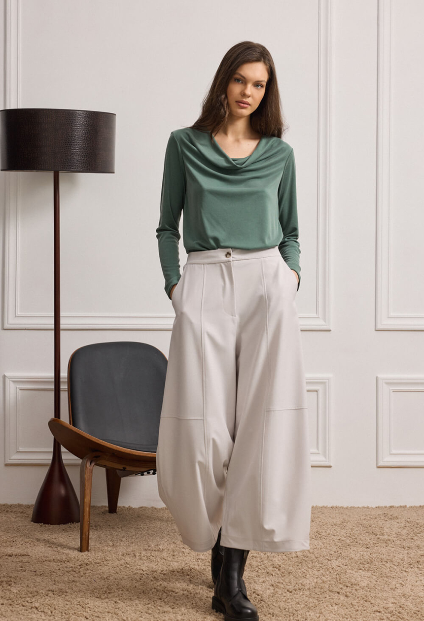 Παντελόνα με διακοσμητικά κοψίματα που συνδυάζει την απλότητα με τον όγκο με απόλυτη ισορροπία. Η ψηλόμεση γραμμή της τονίζει τη μέση, ενώ η φαρδιά σιλουέτα ανοίγει απαλά προς τα κάτω. Οι κομψές ραφές στο μπροστινό μέρος προσθέτουν γραμμικότητα και δίνουν μια σχεδιαστική νότα που ξεχωρίζει. Οι πρακτικές, λοξές τσέπες ολοκληρώνουν το look, ενώ το διακριτικό κλείσιμο με κουμπί και φερμουάρ εξασφαλίζει άψογη εφαρμογή.