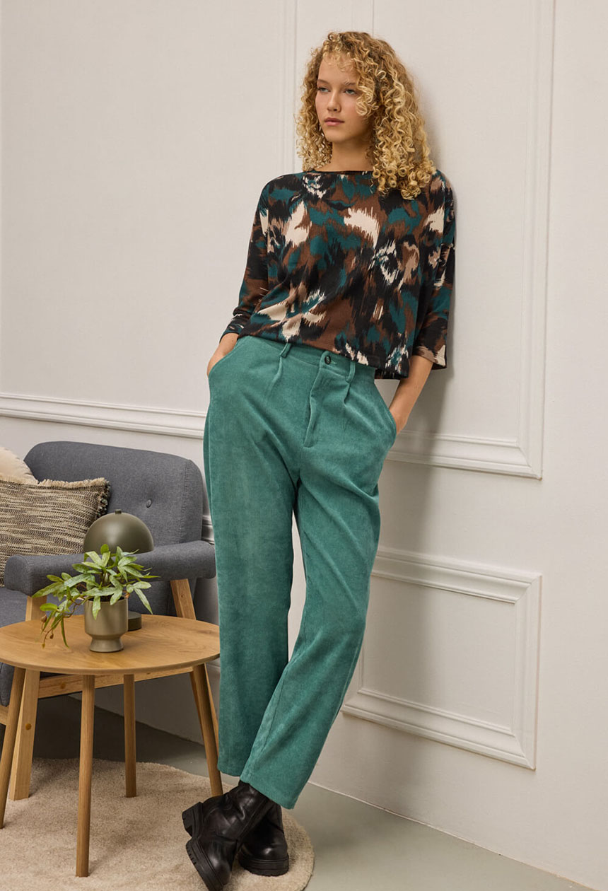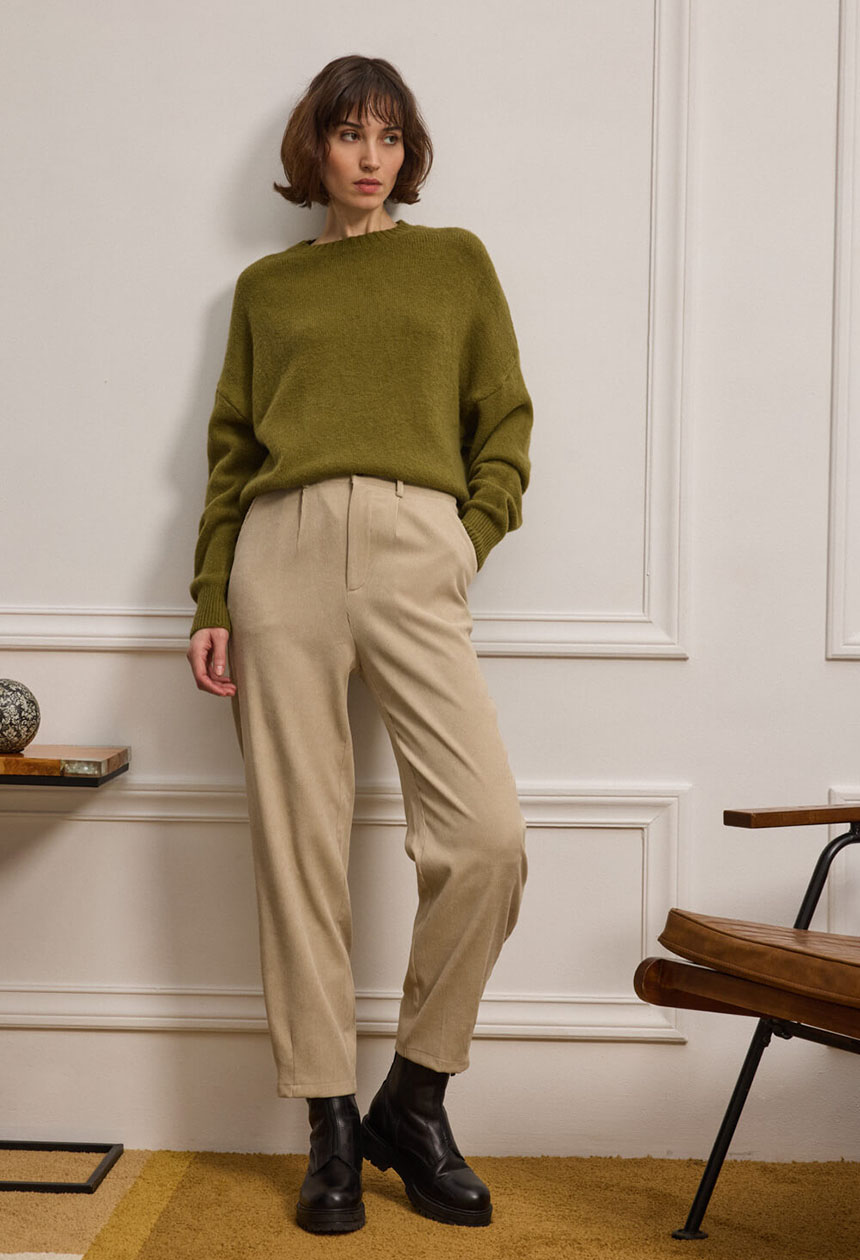 Παντελόνι κλασικό, διαχρονικό και ταυτόχρονα απόλυτα σύγχρονο. Είναι φτιαγμένο από απαλό κοτλέ ύφασμα που χαρίζει βάθος με διακριτική ελαστικότητα, προσφέροντας άνεση στην κίνηση. Διαθέτει ψηλόμεση γραμμή που αγκαλιάζει τη μέση, πιέτες μπροστά που χαρίζουν δομή, και λάστιχο στο πίσω μέρος για άψογη εφαρμογή. Το τελείωμα έχει πένσες που δημιουργεί ελαφρώς tapered γραμμή. Περιλαμβάνει πλαϊνές και πίσω τσέπες με διακριτικό φινίρισμα, και θυλάκια για ζώνη, ενώ το κλείσιμο μπροστά γίνεται με κουμπί και φερμουάρ.