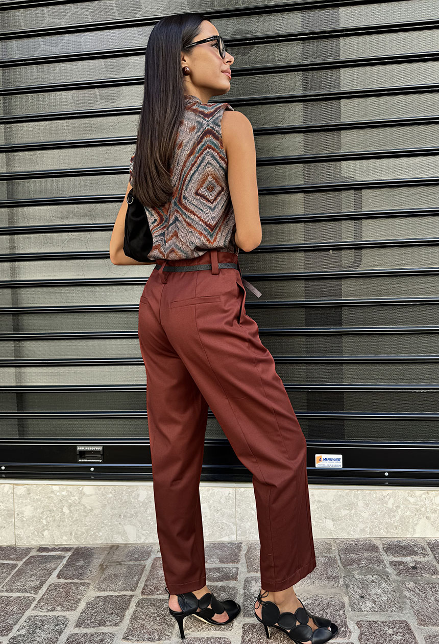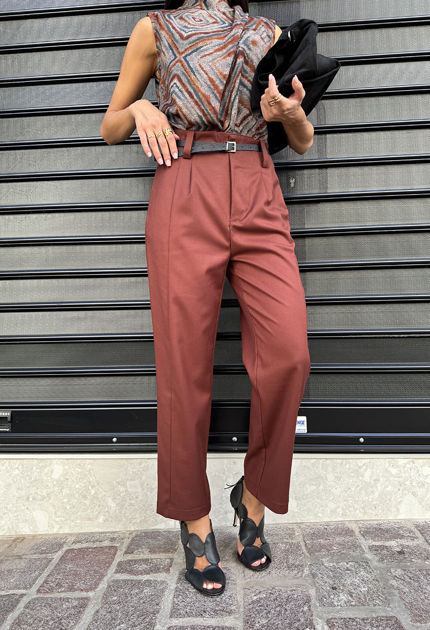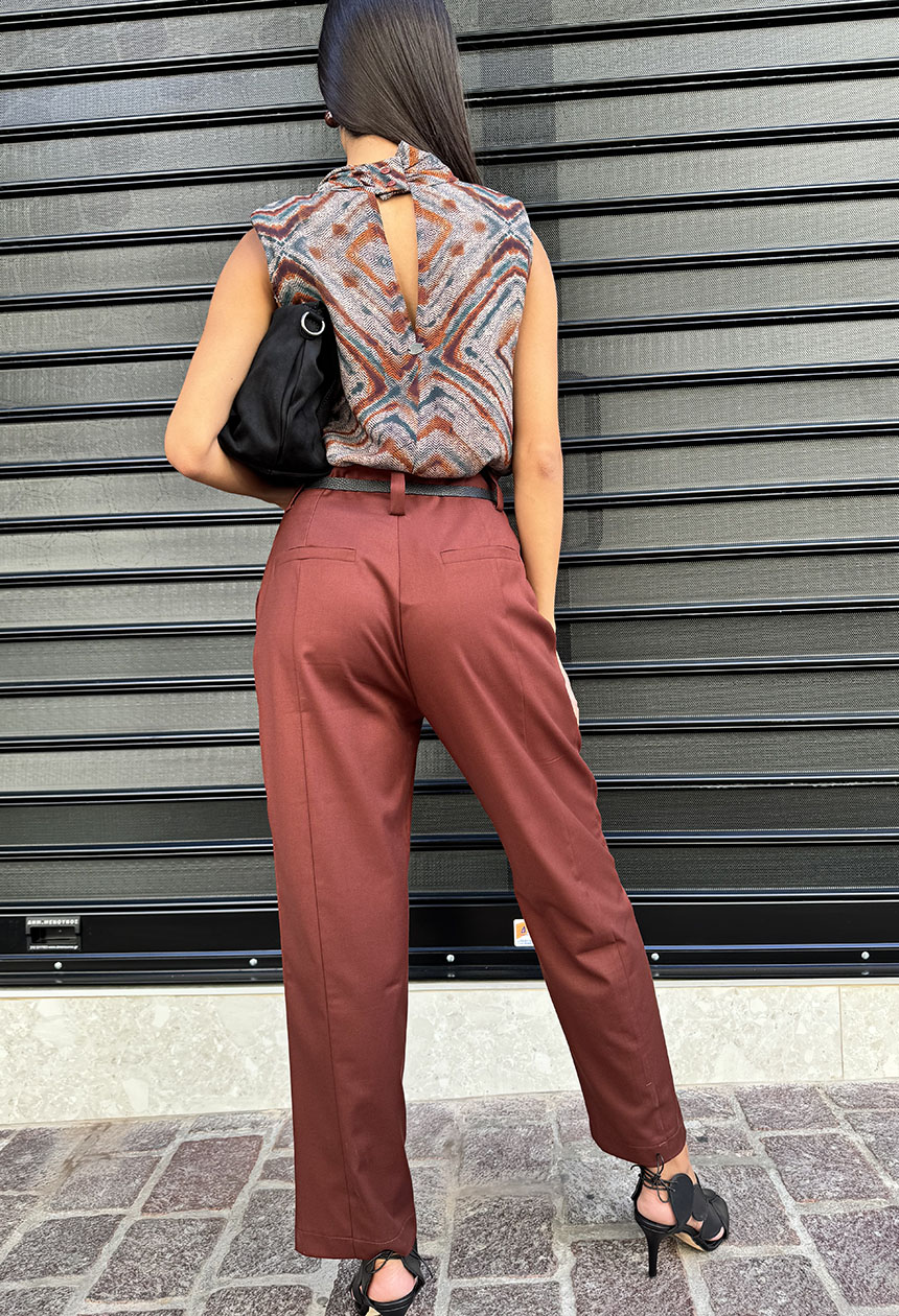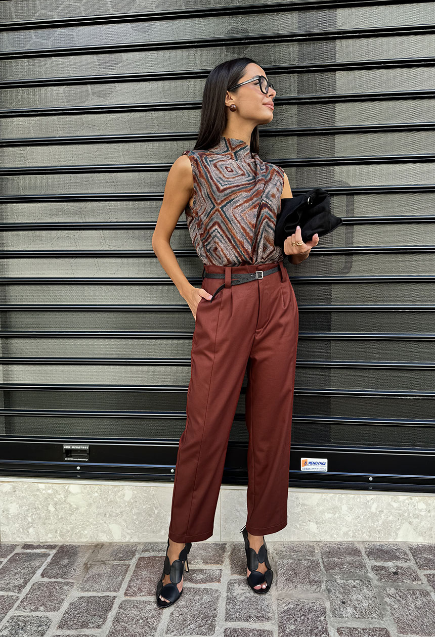Παντελόνι ψηλόμεσο,σε ίσια άνετη γραμμή,πλαινές τσέπες,μικρή πιέτα και διακριτική εξωτερική ραφή,