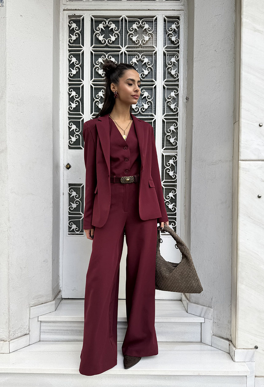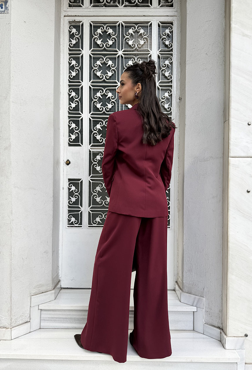 Σακάκι blazer,σε ελαφρώς μεσάτη γραμμή,ύφασμα απαλό σε μπορντώ απόχρωση,εσωτερική φόδρα,μπροστινές τσέπες,γιακάς,πέτο,κλείνει με ένα κουμπί.
