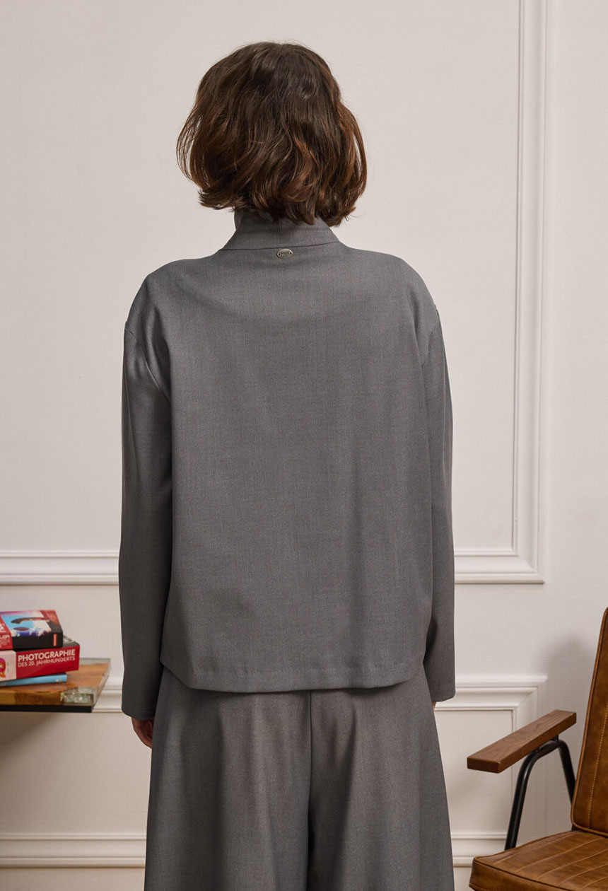 Cropped σακάκι με ανατρεπτικό γιακά Ένα κομμάτι με έξυπνο design, που προσαρμόζεται στο στυλ σου. Ο σχεδιαστικός γιακάς πέτο κρύβει μια ανατρεπτική λεπτομέρεια: κλείνει με κουμπί και μετατρέπεται σε μίνιμαλ mao, προσφέροντας δύο εμφανίσεις σε μία.Η ίσια, άνετη γραμμή του προσφέρει ισορροπία ανάμεσα στη δομή και την ελευθερία κινήσεων. Διαθέτει φόδρα, διακριτικές τσέπες με φιλέτο και μια διακοσμητική στο στήθος, που ολοκληρώνει το tailoring ύφος με λεπτότητα. Ταιριάζει άψογα με το παντελόνι Cantrelle.