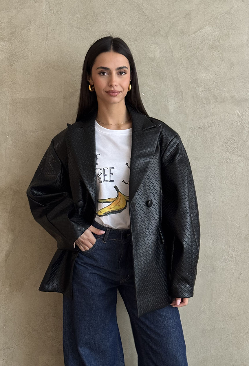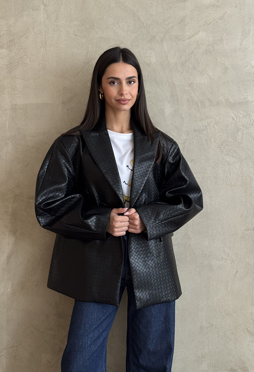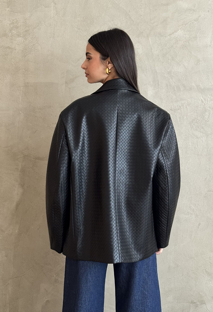 Σακάκι δερματίνη,με ανάγλυφο σχέδιο ψάθα,σε ριχτή γραμμή,φαρδύ μανίκι,εσωτερική φόδρα,κουμπώνει σταυρωτά.