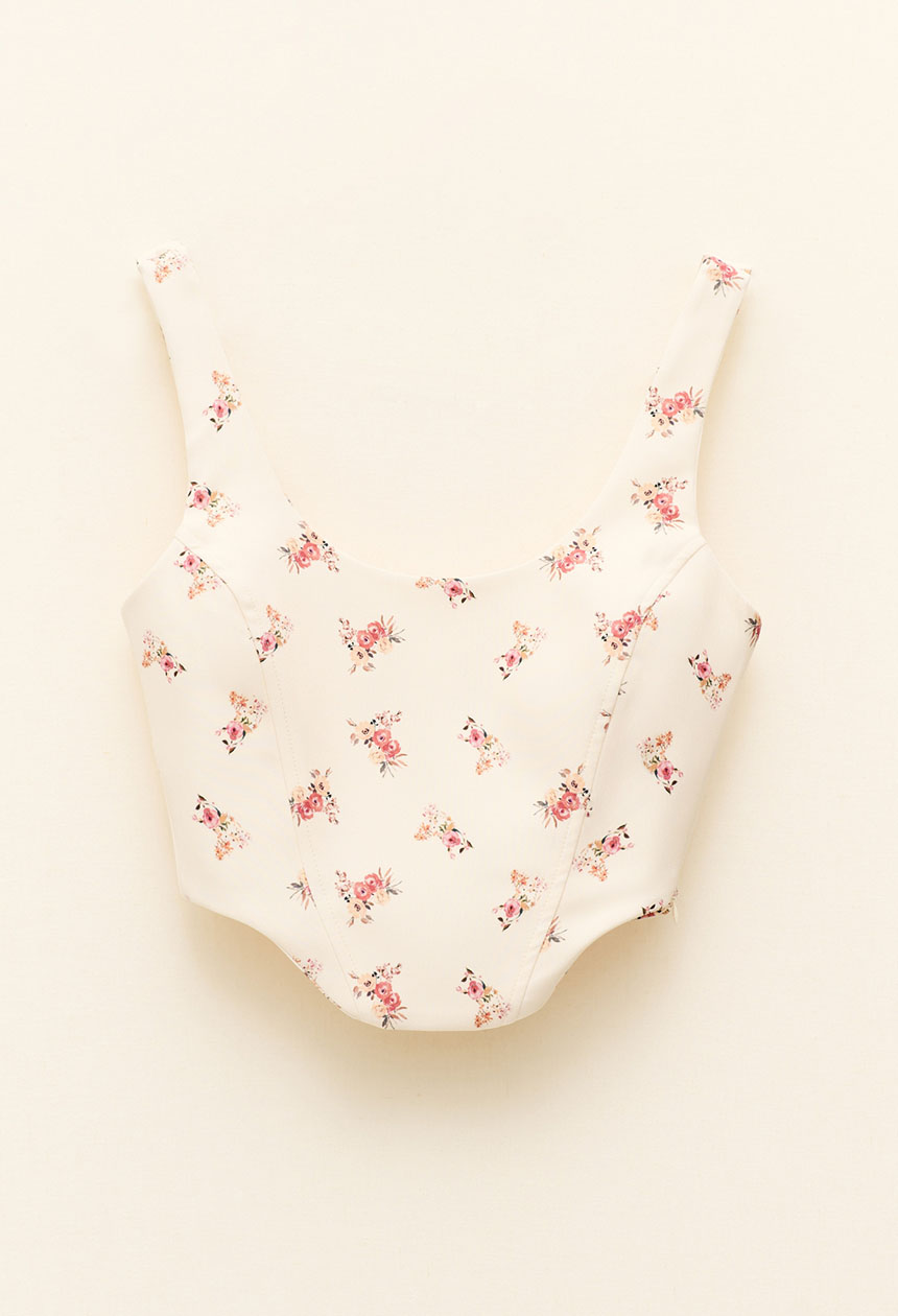 Τοπ με φλοράλ σχέδιο,ανοικτό μπούστο,καμπυλωτό τελείωμα,ελαστική σφυγγοφωλιά στη πλάτη,κλείνει με κρυφό φερμουάρ στο πλάι.